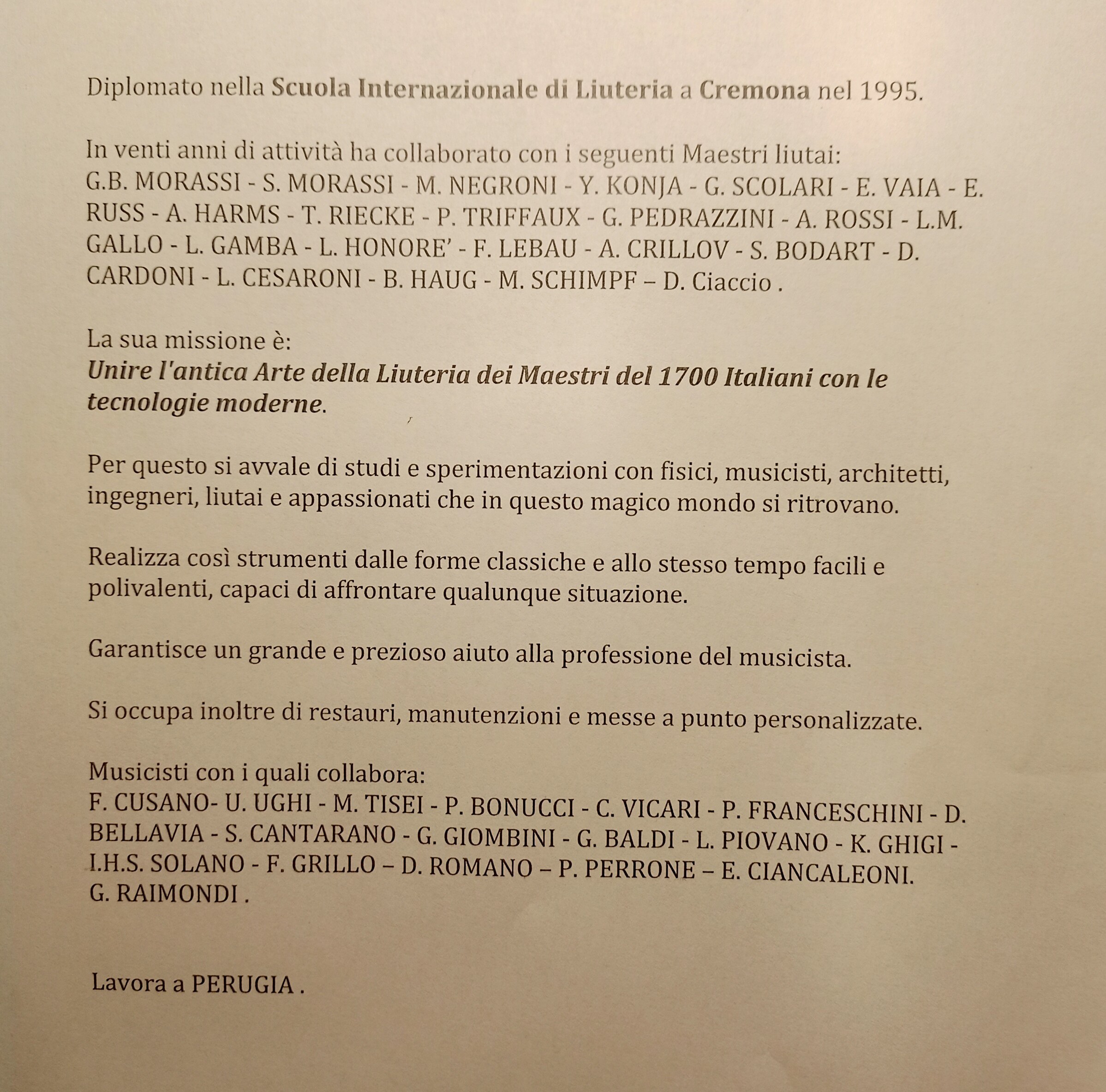 Sono nato nel 1969 a Perugia tra le verdi colline dell'Umbria. Fin da bambino, giocando nel laboratorio di scultura di mio nonno materno, ho mostrato un'innata inclinazione per la lavorazione del legno. Dallo stesso nonno ho inoltre ereditato la passione per la musica che mi ha spinto allo studio del pianoforte classico al Conservatorio di Perugia e che tutt'ora mantengo viva suonando in diverse formazioni di jazz. L'interesse per la liuteria si è quindi formato dalla unione delle passioni per la scultura del legno e della musica. Ho frequentato la Scuola per Maestri Liutai e Archettai in Gubbio, dove ho costruito i miei primi strumenti e al termine del corso triennale ho deciso di dedicarmi alla liuteria per professione. Ho così scelto di trasferirmi nel Regno Unito per frequentare la prestigiosa Newark School of Violin Making che mi ha permesso di raggiungere un livello altamente professionale. Al termine del corso triennale ho lavorato presso il laboratorio del Maestro liutaio Roger Hansell, nel North Yorkshire, dove ho ulteriormente affinato le mie tecniche di costruzione. Nel 2010 sono tornato in Italia e ho aperto il mio laboratorio a Perugia. Per maggiori informazioni vedi il sito - clicca quì