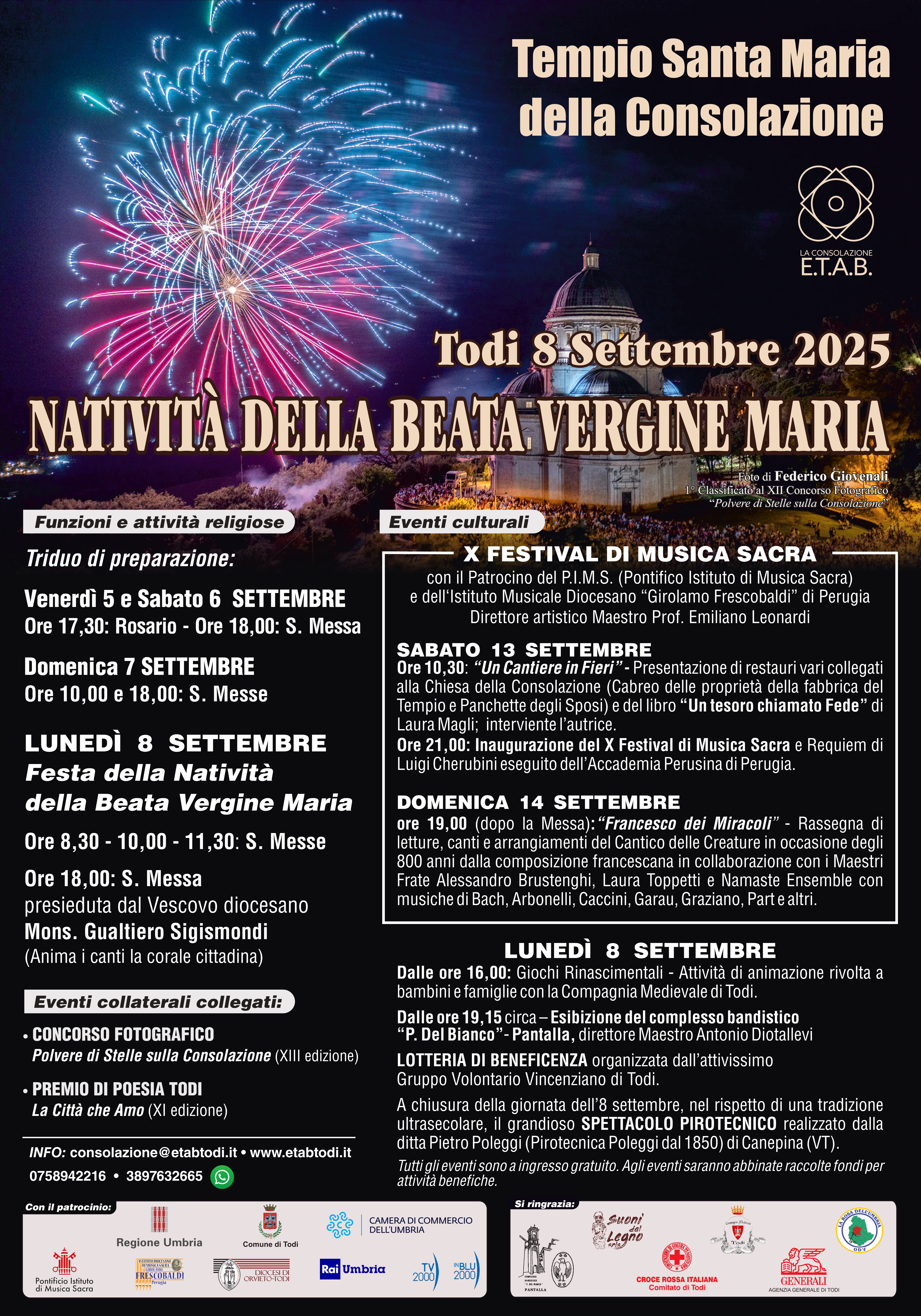 La Festa della Consolazione e il Festival di Musica Sacra rappresentano un'occasione unica per celebrare l'unità della comunità tuderte e per accogliere i numerosi ospiti che, dopo il Todi Festival, decideranno di prolungare la loro permanenza in città.