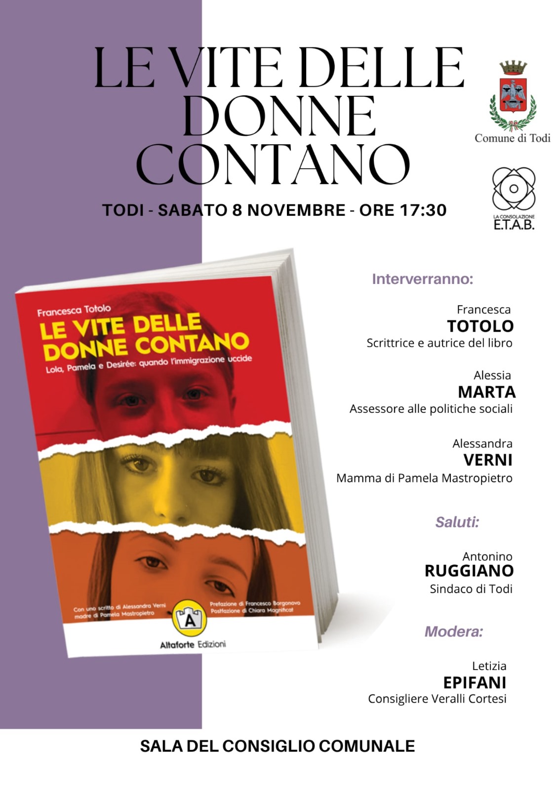 L’autrice sarà presente insieme ad Alessandra Verni, madre di Pamela Mastropietro, la cui tragica vicenda ha profondamente scosso la coscienza del Paese. Interverrà inoltre Alessia Marta, Assessore alle Politiche Sociali del Comune di Todi.